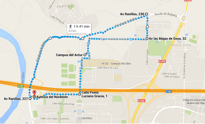 En la Rotonda de Juslibol continuaremos recto. A la altura de la Calle la Fragua giraremos hacia la derecha y bajaremos hacia Parque Goya.