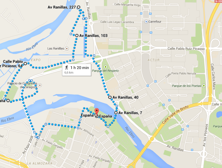 Comenzamos dentro del Parque del Agua llegando hasta la orilla del Ebro y regresamos en dirección a la Plaza de las Banderas.